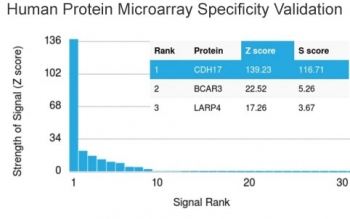 Analysis of HuProt (TM) microarray containing more than 19000 full-length human proteins using Cadherin 17 antibody (clone CDH17/2615). These results demonstrate the foremost specificity of the CDH17/2615 mAb. Z- and S- score: The Z-score represents the strength of a signal that an antibody (in combination with a fluorescently-tagged anti-IgG secondary Ab) produces when binding to a particular protein on the HuProt (TM) array. Z-scores are described in units of standard deviations (SD's) above the mean value of all signals generated on that array. If the targets on the HuProt (TM) are arranged in descending order of the Z-score, the S-score is the difference (also in units of SD's) between the Z-scores. The S-score therefore represents the relative target specificity of an Ab to its intended target.