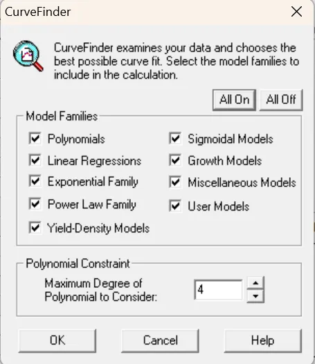 5. 在第一个对话框的右上角出现一些曲线的名称。从“1”开始,依次点击曲线名称,右下角会出现对应的拟合曲线。(一般选择第一个多项式拟合)