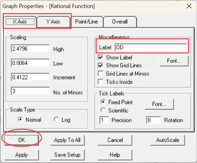 11.修改绘图的 X、Y 轴的相关属性。选择步骤9所示图中的第二行“Graph Properties”,修改后点击确定保存。