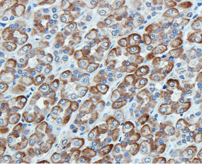 CD38 antibody (orb10319) works very well in my mouse stomach IHC tests! Our results show beautifully specific staining in the cell membrane and cytoplasm! The dilution rate of primary antibody is 1:300.